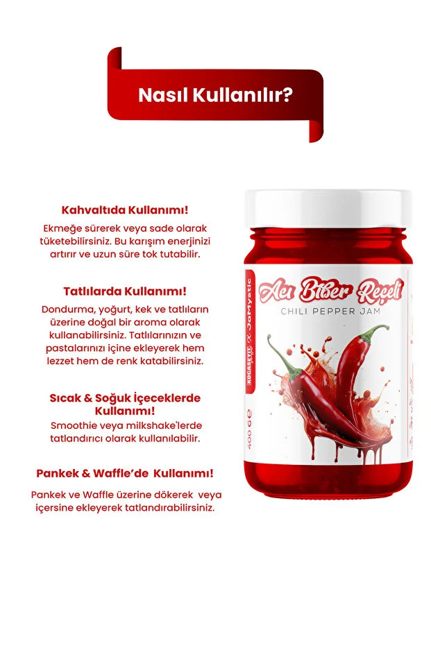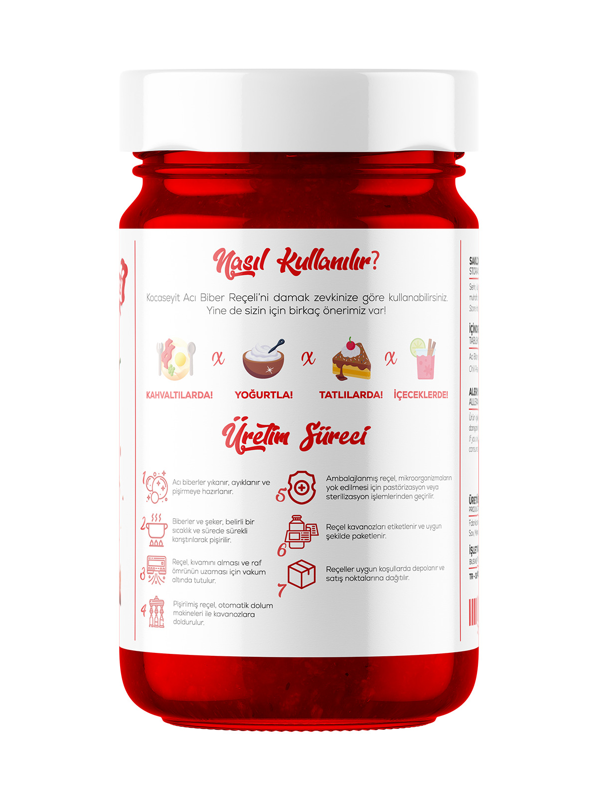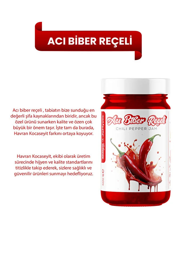 Kocaseyit® Acı Biber Reçeli – Kahvaltılara Lezzet ve Renk Katın! Geleneksel Lezzetin Acı Dokunuşu Kocaseyit Acı Biber Reçeli, özenle seçilmiş acı biberlerin tatlı bir reçelide buluşmasıyla ortaya çıkan eşsiz bir lezzettir. Kahvaltı sofralarınıza hem renk hem de farklı bir tat katacak bu özel reçel, güne zinde ve enerjik başlamanıza yardımcı olur. Doğallığın ve Lezzetin Buluşması Geleneksel yöntemlerle hazırlanan Kocaseyit Acı Biber Reçeli, hiçbir katkı maddesi veya koruyucu içermez. Tamamen doğal içeriğiyle sağlığınızı düşünürken, damaklarınızda unutulmaz bir tat bırakır. Her Damağa Uygun Acı Dengesi Acı severler için özel olarak hazırlanan Kocaseyit Acı Biber Reçeli, ideal acı dengesiyle her damağa hitap eder. Kahvaltılıklarınızın yanında, peynir tabağınızda veya farklı tariflerinizde kullanabileceğiniz bu özel reçel, lezzetli olduğu kadar çok yönlüdür. Sofralarınızın Vazgeçilmezi Olacak! Kocaseyit Acı Biber Reçeli, farklı ve özgün lezzetiyle kahvaltı sofralarınızın vazgeçilmezi olacak. Şimdi deneyin, güne lezzetli bir başlangıç yapın! Ürün Özellikleri: Tamamen doğal ve katkısız Geleneksel yöntemlerle üretilmiştir İdeal acı dengesi Çok yönlü kullanım imkanı Uzun süre tazeliğini korur Saklama Koşulları: Serin ve kuru bir yerde, güneş ışığından uzakta saklayınız. Açıldıktan sonra buzdolabında muhafaza ediniz.