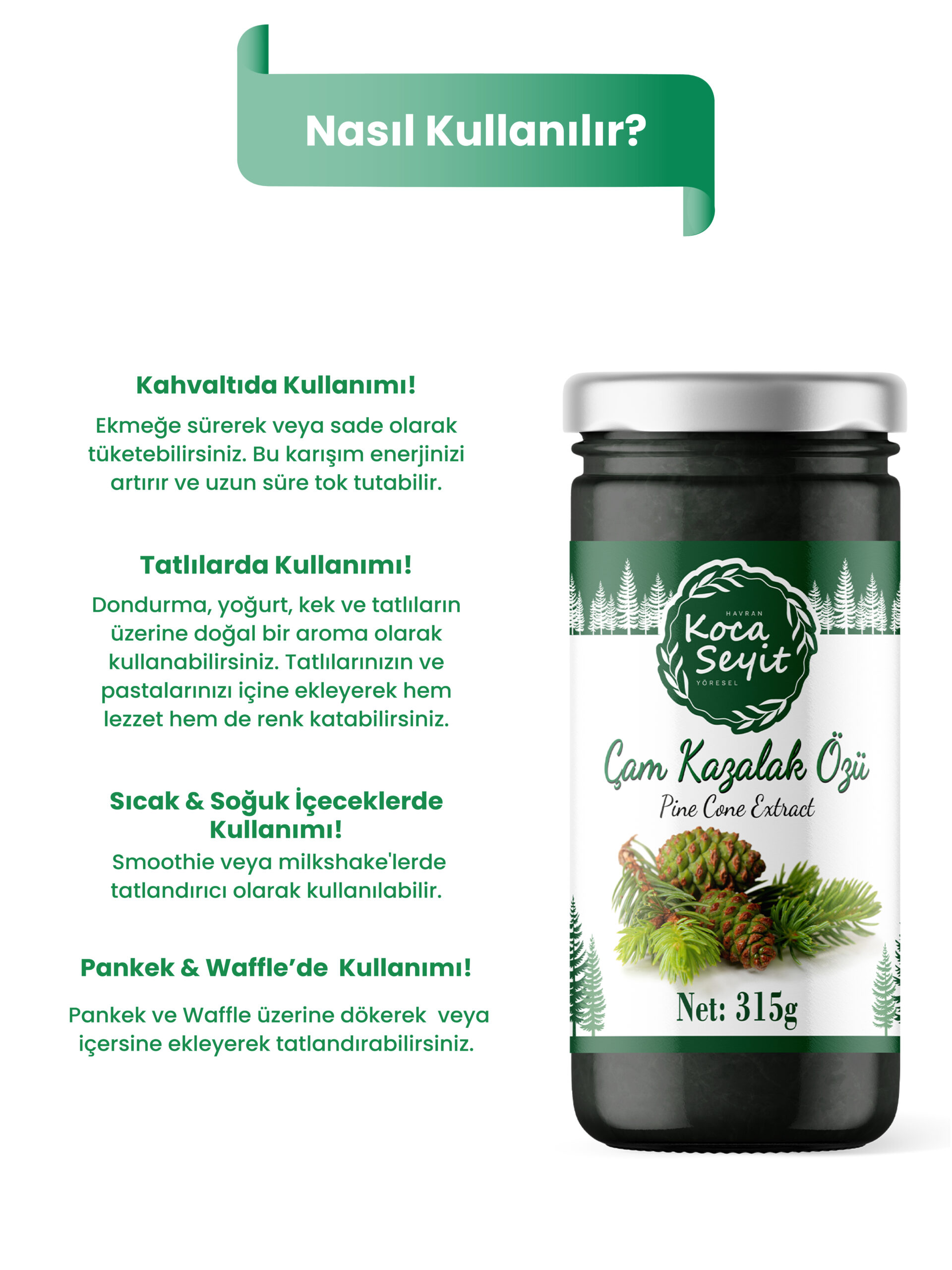 Kocaseyit® Çam Kozalak Özü, keyifli bir tüketim deneyimi sunar. Lezzetin yanı sıra vitamin ve mineral değerleriyle de ön plana çıkan bu ürün, her damlasıyla benzersiz bir tat ve keyif sunar.