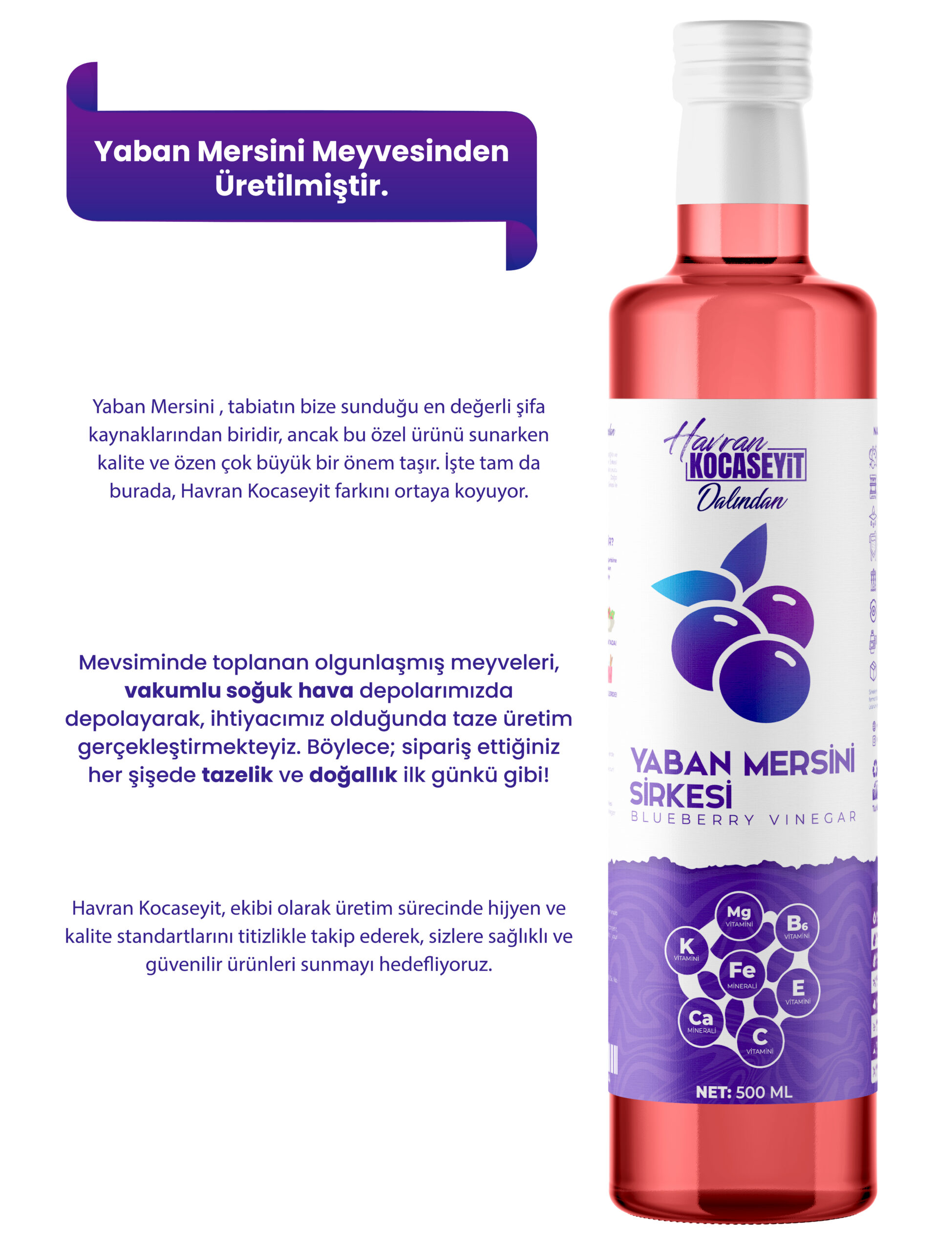 Doğal fermente yöntemlerle üretilen Havran Kocaseyit Yaban Mersini Sirkesi, lezzeti ve faydalarıyla sofralarınıza sağlık getiriyor. Ege’nin verimli topraklarında yetişen taze yaban mersinlerinin özenle işlenmesiyle elde edilen bu sirke, hiçbir katkı maddesi içermeden doğal olarak üretilmiştir.