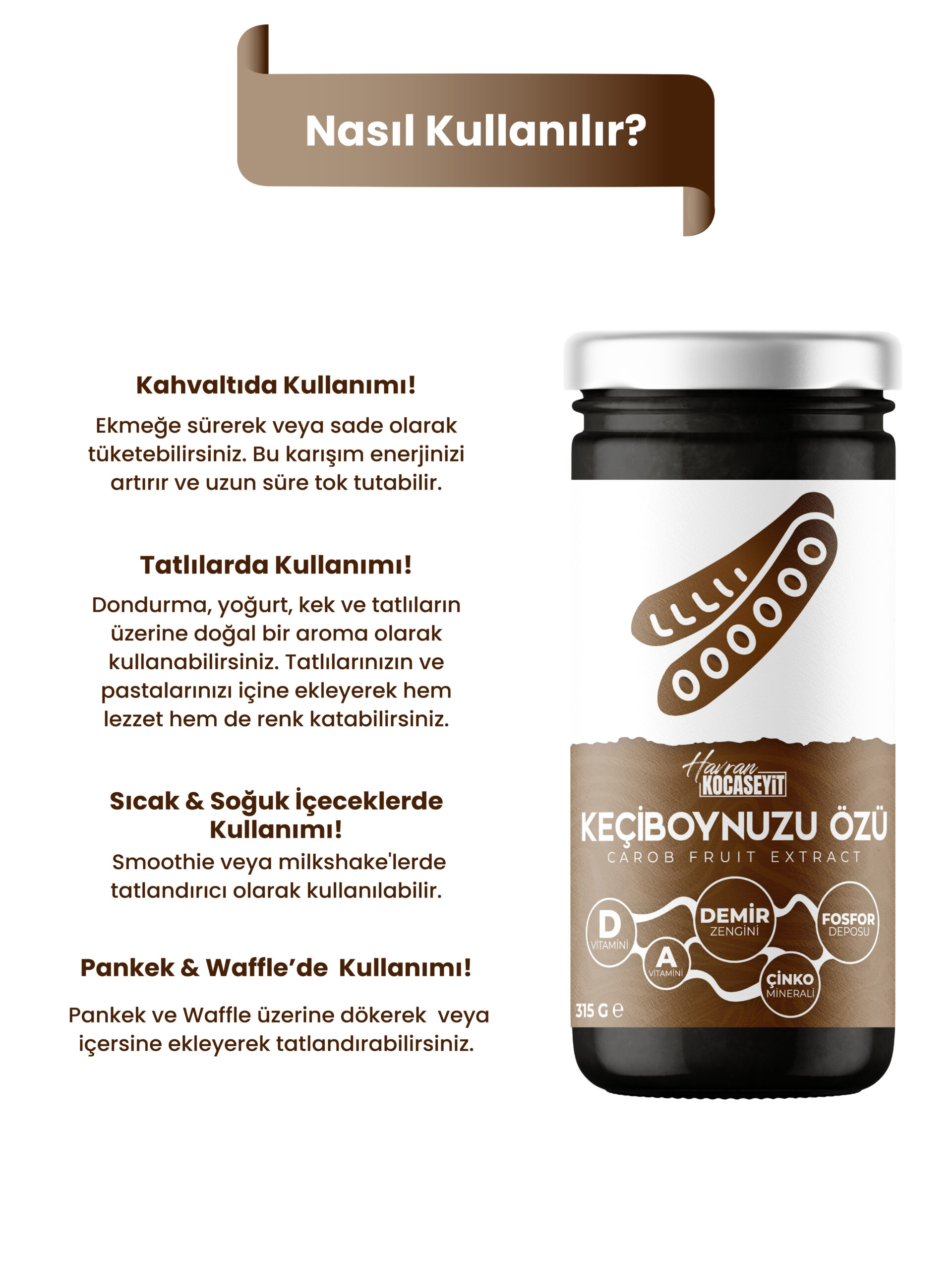 Bu ürün, kendine özgü lezzetiyle öne çıkar. Keçiboynuzu meyvesinin özgün tadıyla birlikte, vücuda gerekli olan vitamin ve mineralleri sağlayarak günlük beslenmenin önemli bir parçası olabilir.