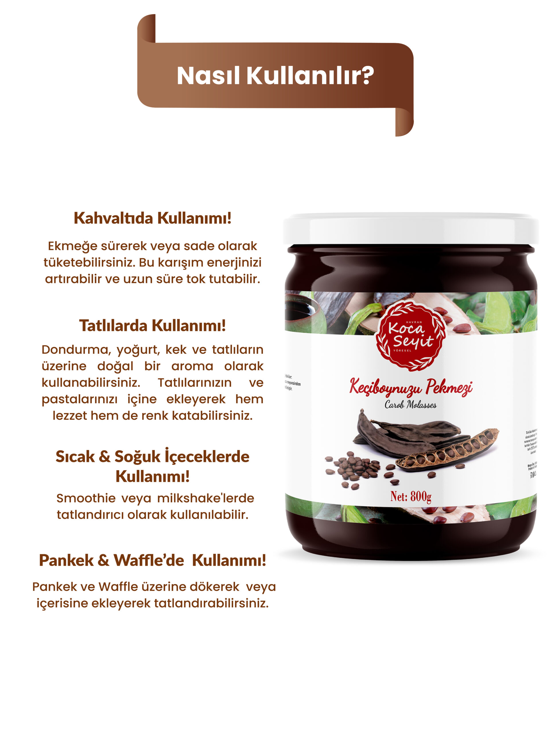 Kocaseyit® Keçiboynuzu Pekmezi, keyifli bir tüketim deneyimi sunar. Lezzetin yanı sıra vitamin ve mineral değerleriyle de ön plana çıkan bu ürün, her damlasıyla benzersiz bir tat ve keyif sunar.