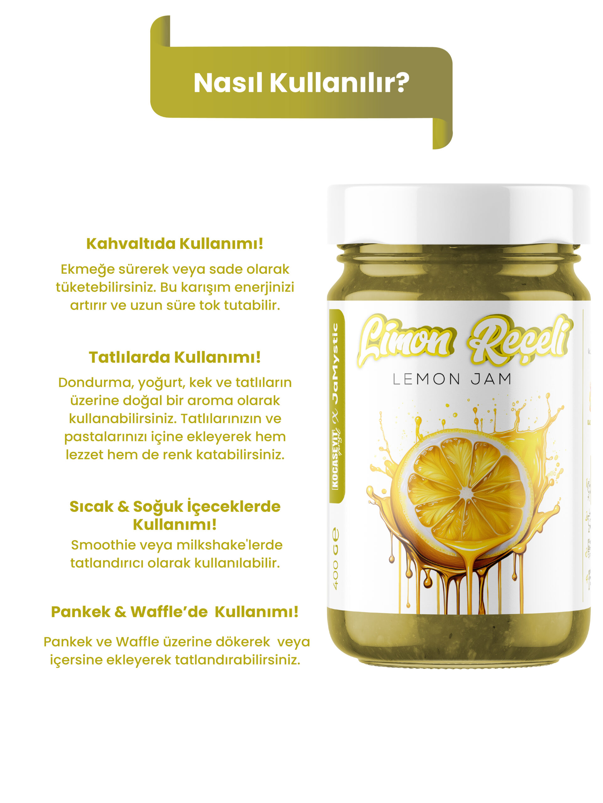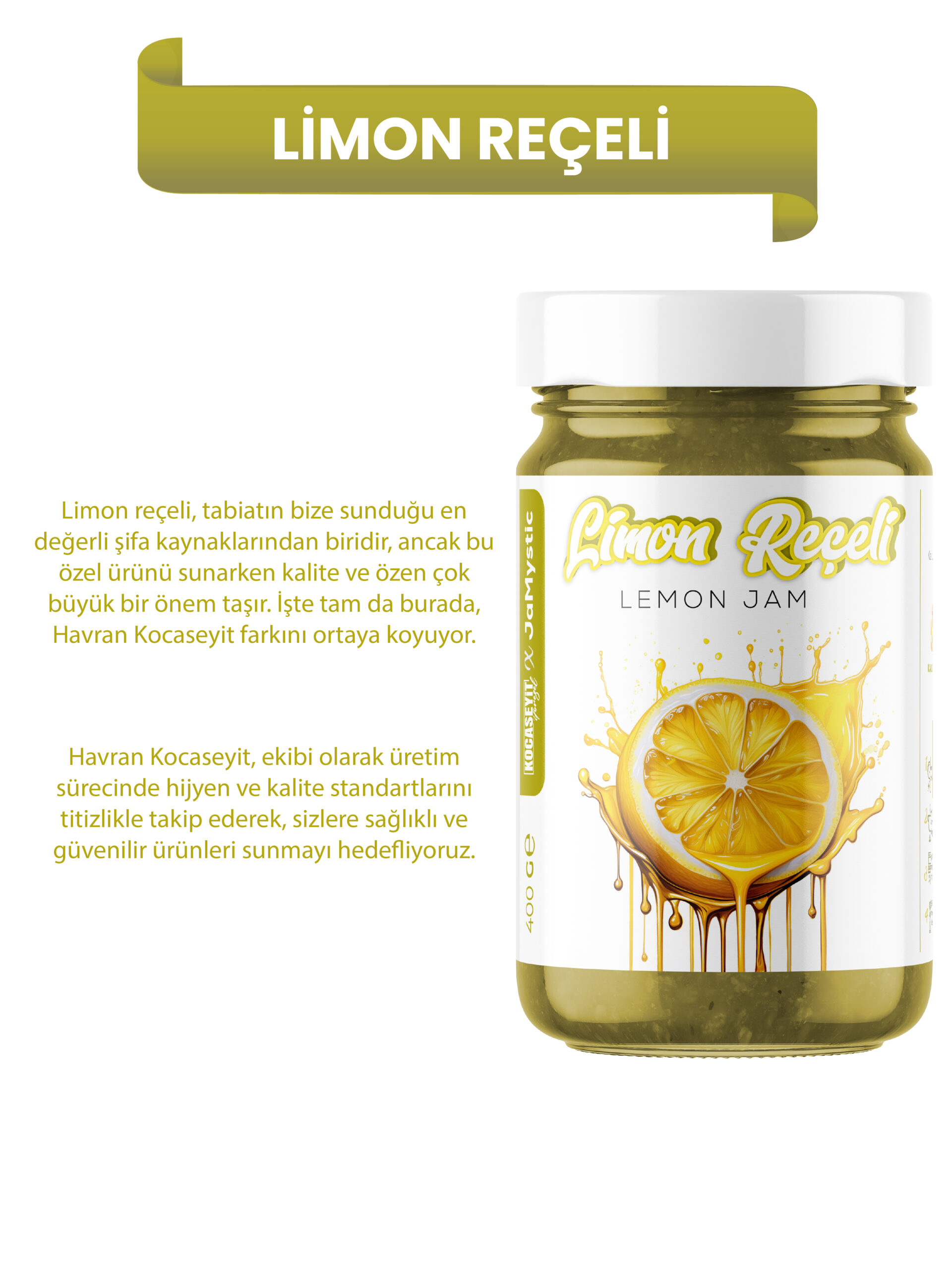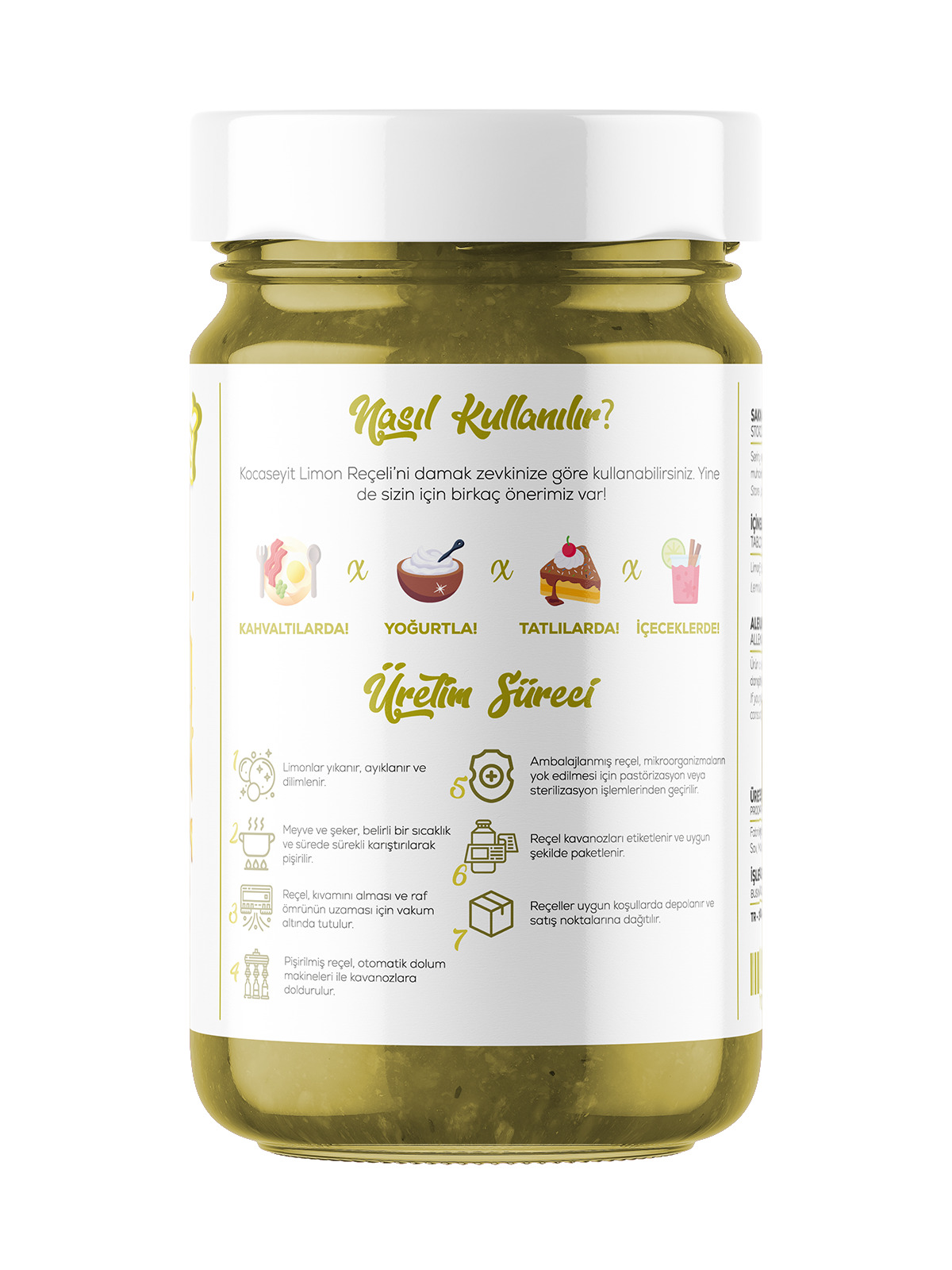 Eşsiz Bir Akdeniz Lezzeti Kocaseyit Limon Reçeli, özenle seçilmiş Akdeniz limonlarının kabuklarıyla birlikte geleneksel yöntemlerle reçele dönüştürülmesiyle hazırlanır. Limonun ferahlatıcı kokusu ve eşsiz tadı, bu reçelde aynen korunur. Her kaşıkta güneşin tadını ve Akdeniz’in serinliğini hissedersiniz. Doğallığın ve Lezzetin Buluşması Kocaseyit Limon Reçeli, hiçbir katkı maddesi veya koruyucu içermez. Tamamen doğal içeriğiyle sağlığınızı düşünürken, damaklarınızda unutulmaz bir tat bırakır. Limonun doğal ekşiliği ve tatlılık dengesi, bu reçelin vazgeçilmez olmasını sağlar. Kahvaltılara Ferahlık Katın Kocaseyit Limon Reçeli, kahvaltılıklarınızın yanında, çayınızın yanında veya farklı tariflerinizde kullanabileceğiniz çok yönlü bir lezzettir. Özellikle kurabiye ve keklere eşsiz bir aroma katar. Ürün Özellikleri: Tamamen doğal ve katkısız Geleneksel yöntemlerle üretilmiştir Akdeniz’in taze limonlarının lezzeti C vitamini deposu Uzun süre tazeliğini korur Saklama Koşulları: Serin ve kuru bir yerde, güneş ışığından uzakta saklayınız. Açıldıktan sonra buzdolabında muhafaza ediniz.